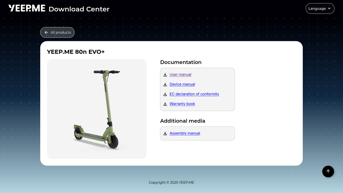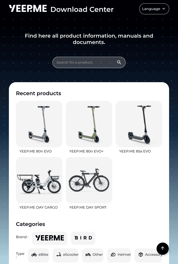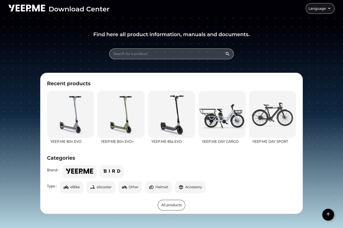 The YEEP.ME Download Center is a website where YEEP.ME customers can find the documentation for their products, as well as confortmity certificates and warranty conditions.